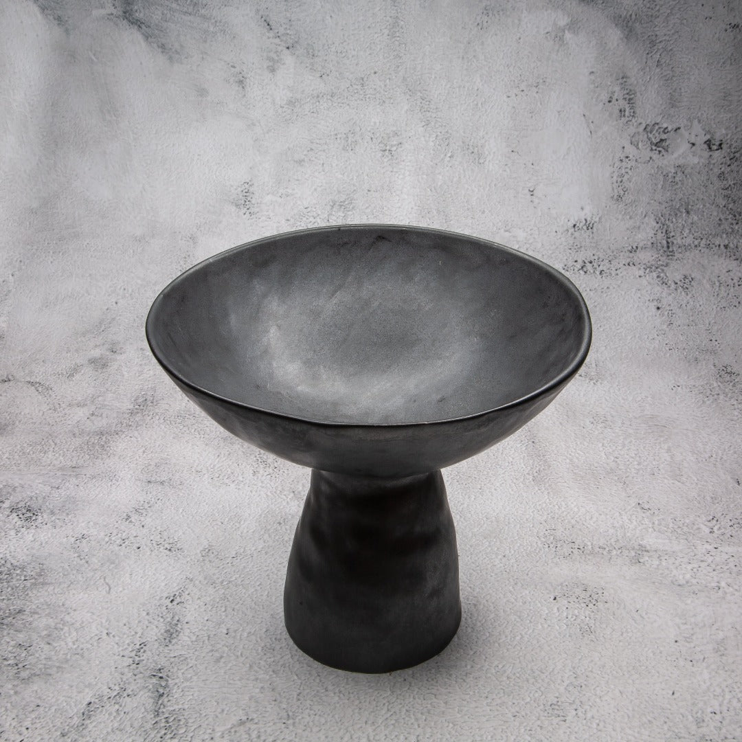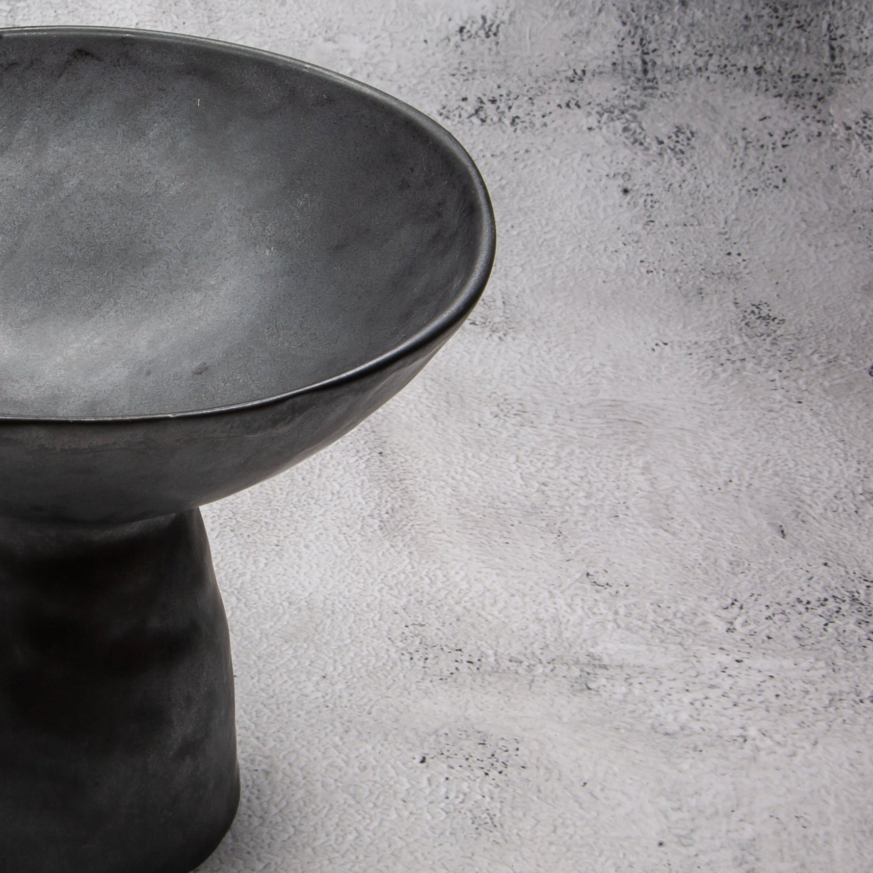 Juodos pusiau matinės glazūros dubuo ant kojelės. Indas gali būti naudojamas kaip interjero detalė arba būti skirtas susidėti smulkmenoms.