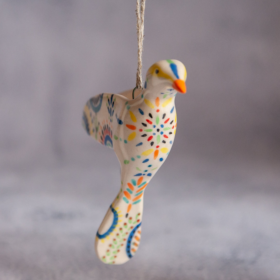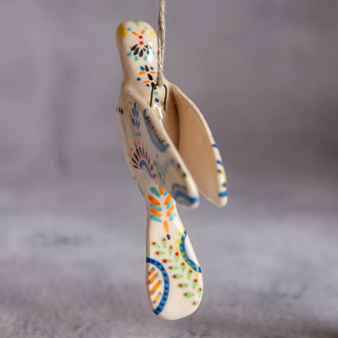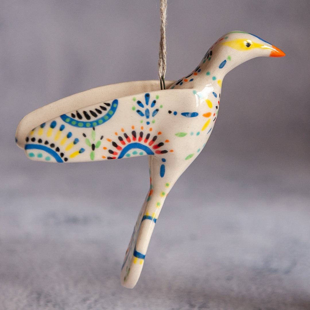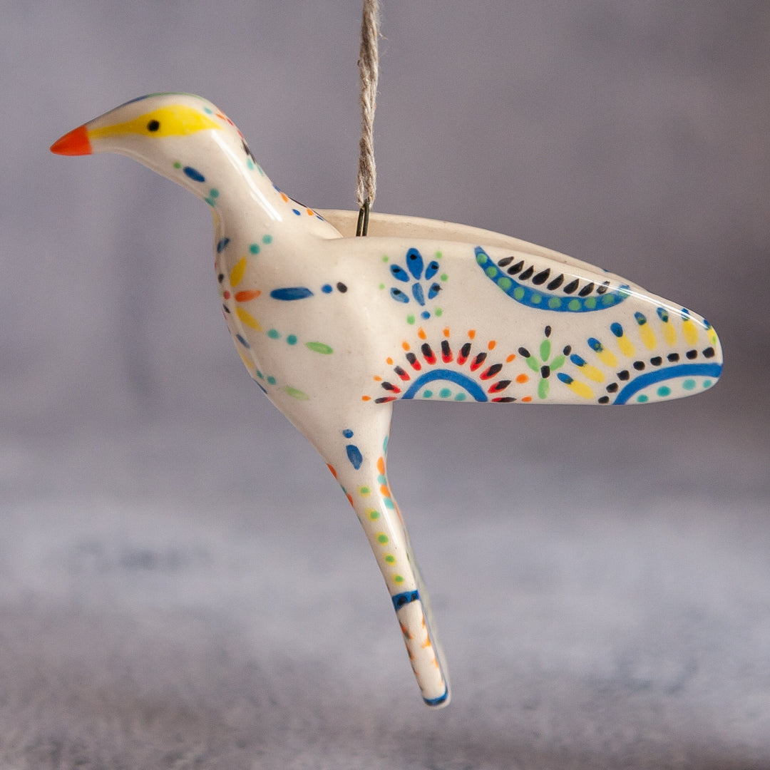 Šis paukštelis išmargintas įvairių spalvų raštais. Turi metalinę kilpelę, skirtą pririšti virvelei ir pakabinti ant šakos (Kalėdoms ant eglės, Velykoms - ant beržo šakelės). Tai vienetinis kūrinys.