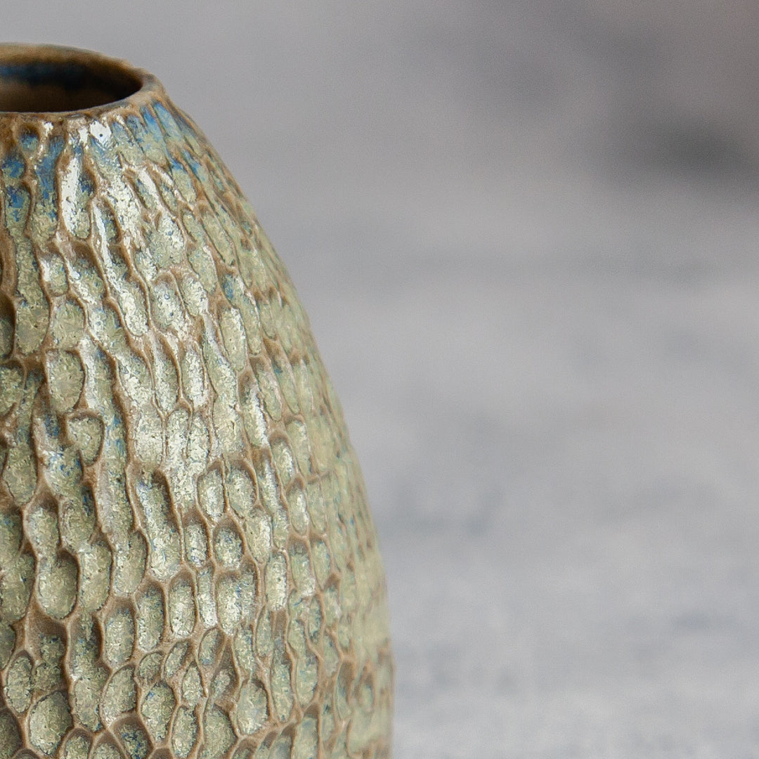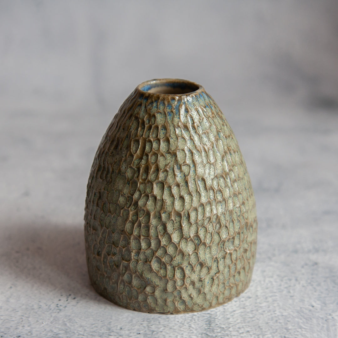 Žalsva nedidelė vaza, kurios paviršius išraižytas nedideliais įdubimais. Vazoje tilps nedidelės pievų ar pavasario gėlės (pvz; žibuoklės, plukės ir kt.). Taip pat galima panaudoti kaip interjero puošmeną.