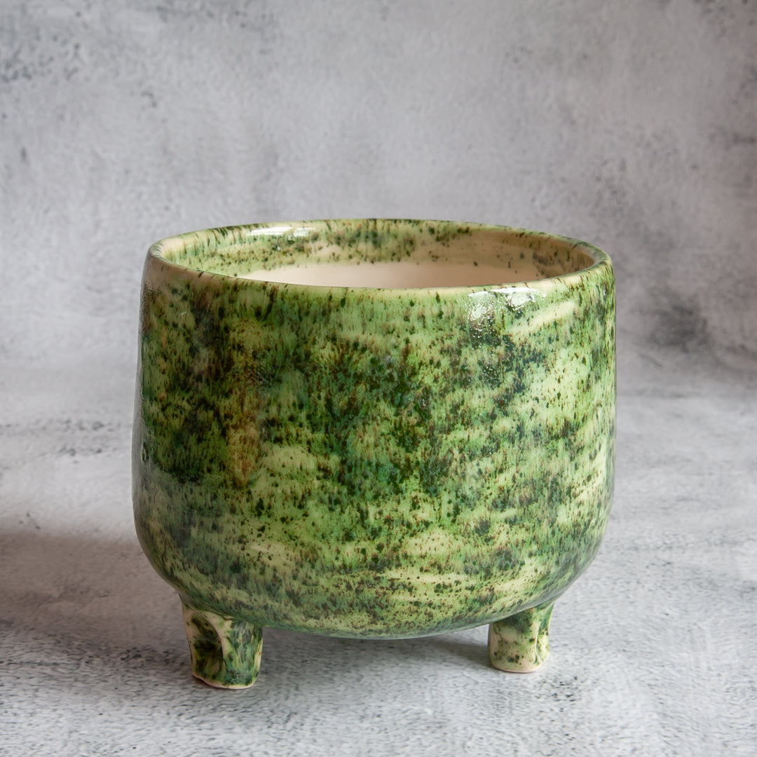 Balto molio vazonėlis, kurio išorę dengia žalia, samanas primenanti glazūra. Jame tilptų nedidelis augalas ar keletas kaktusų. Gaminio vidus padengtas skaidria glazūra. O vazonėlis stovi ant trijų nedidelių kojelių.