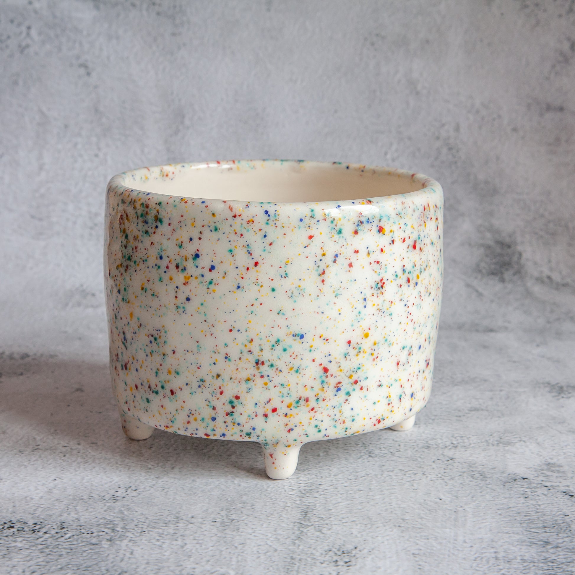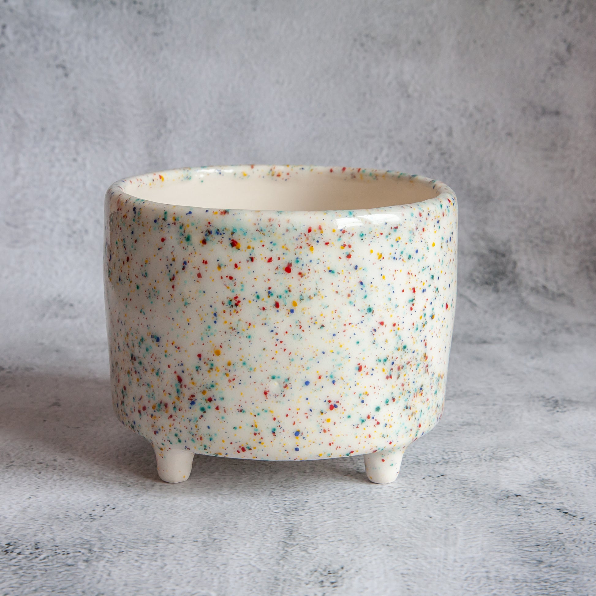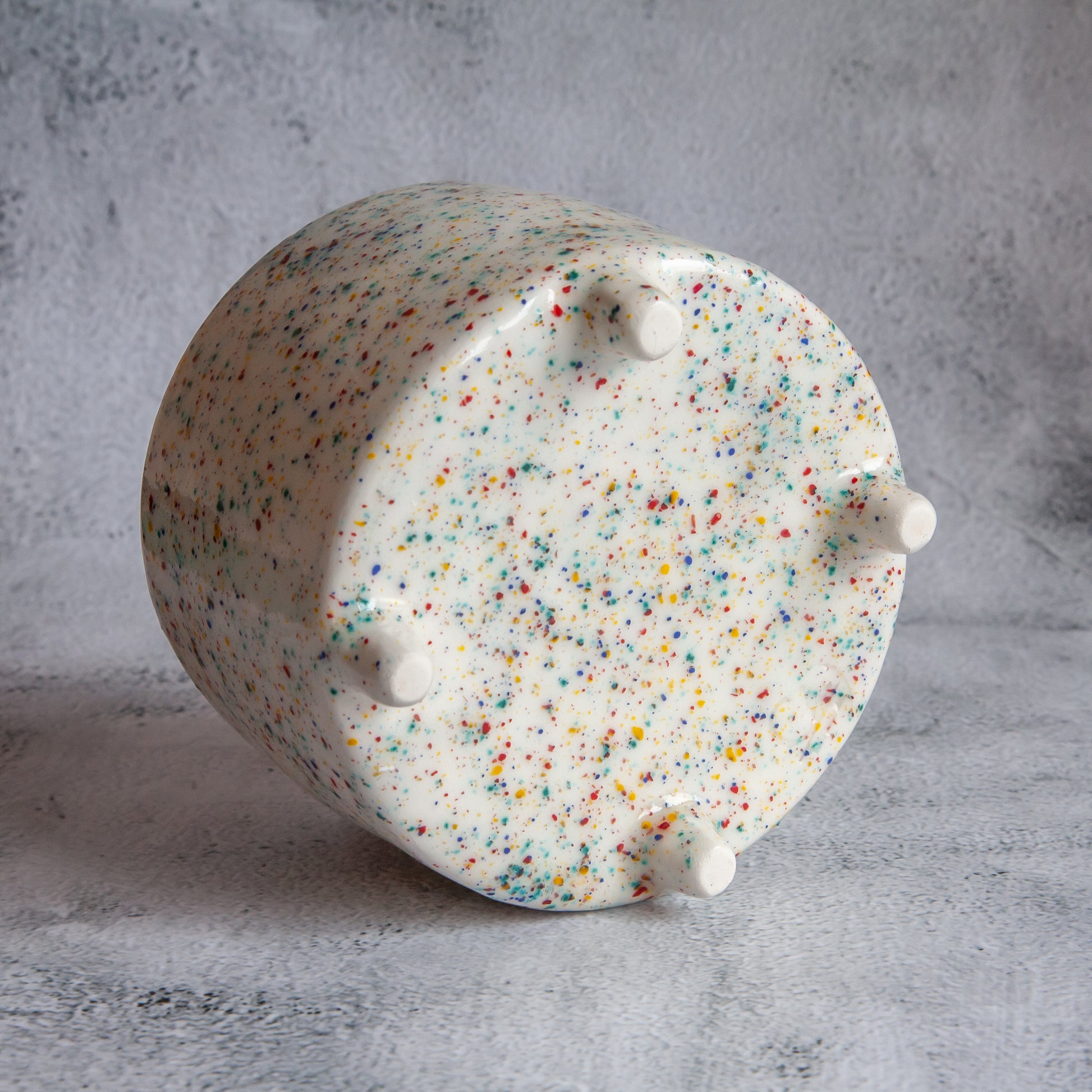 Balto molio vazonėlis, kurio išorę dengia skaidri su žaismingų spalvų taškeliais glazūra. Jame tilptų nedidelis augalas ar keletas kaktusų. Gaminio vidus padengtas skaidria glazūra. O vazonėlis stovi ant keturių nedidelių kojelių.
