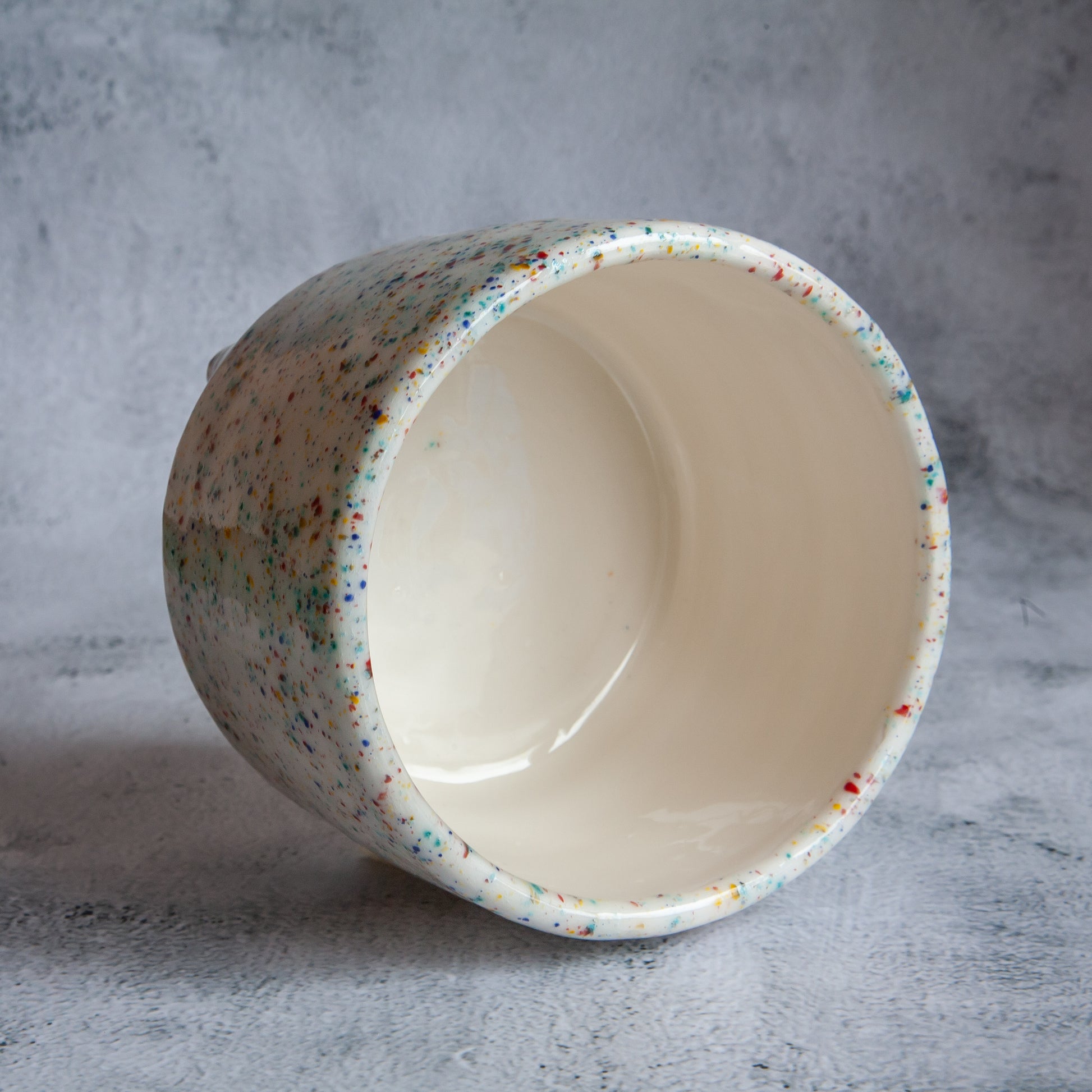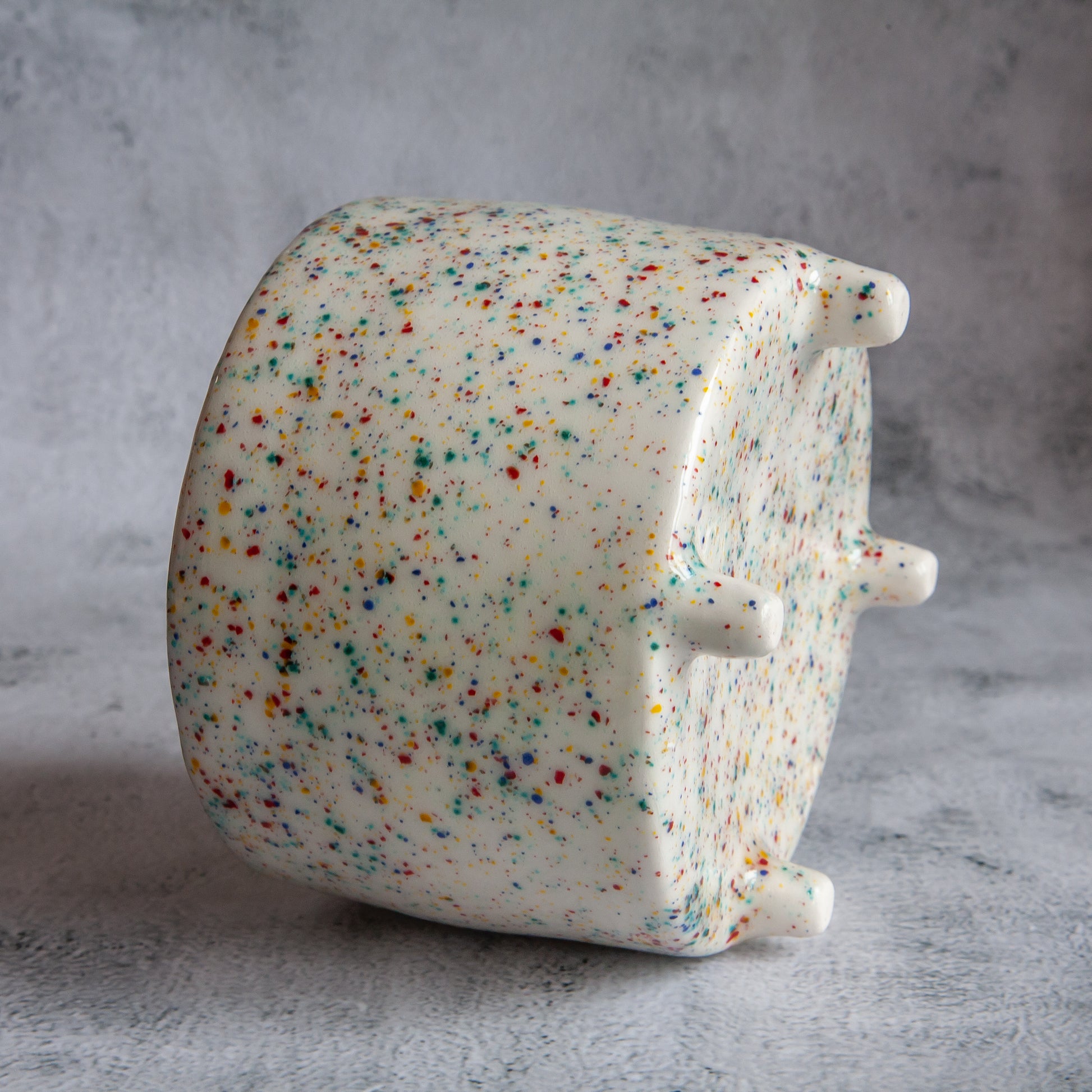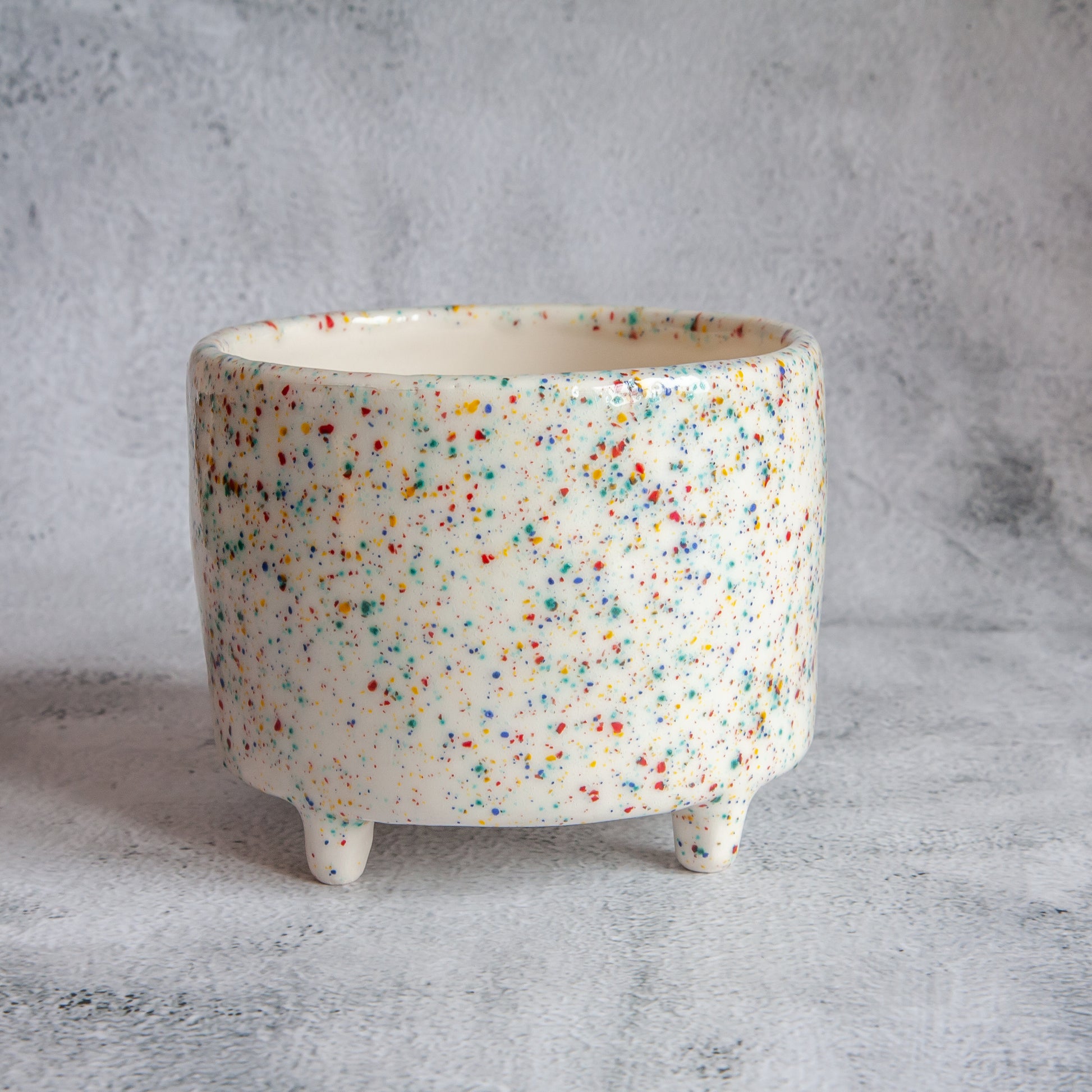 Balto molio vazonėlis, kurio išorę dengia skaidri su žaismingų spalvų taškeliais glazūra. Jame tilptų nedidelis augalas ar keletas kaktusų. Gaminio vidus padengtas skaidria glazūra. O vazonėlis stovi ant keturių nedidelių kojelių.