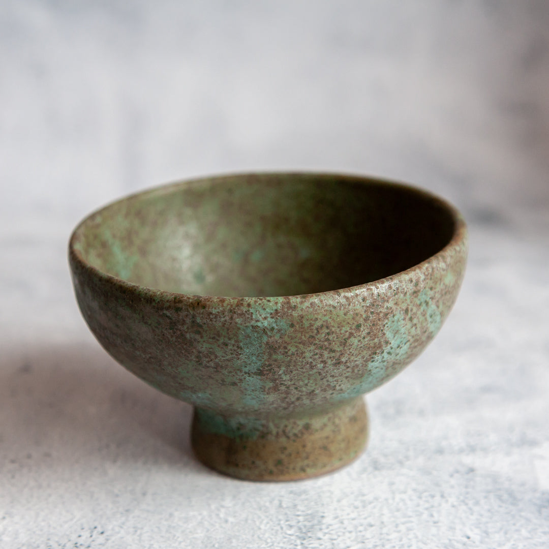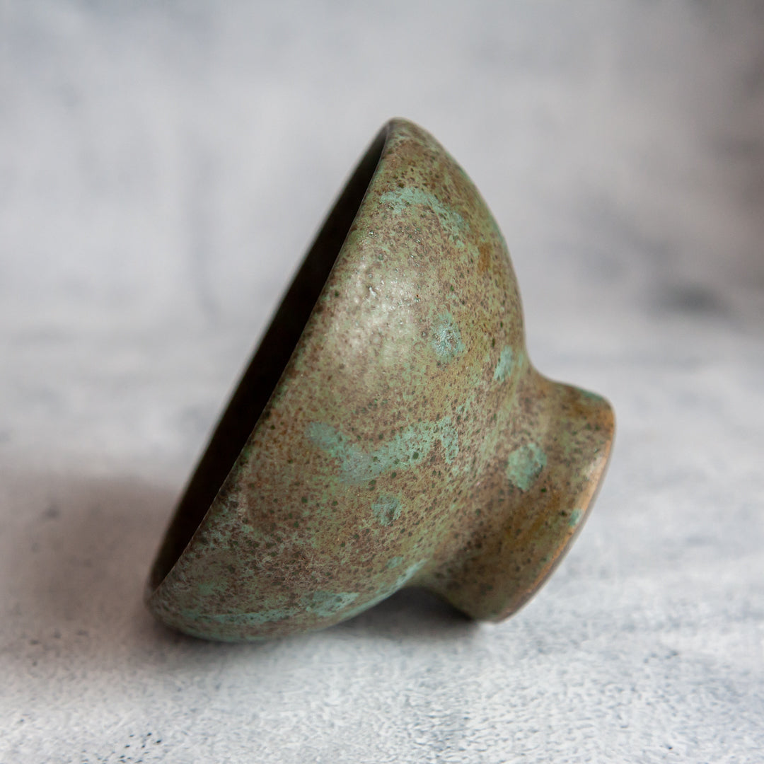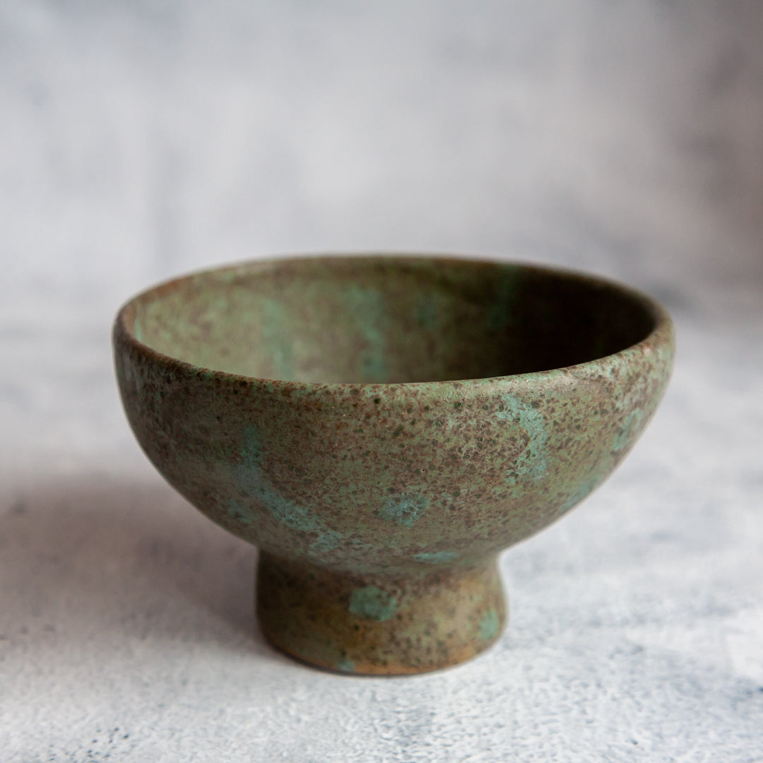 Dubens paviršius išmargintas smaragdo spalvos taškeliais, kurie įsilieja į pusiau matinį bei dėmėtą raštą. Glazūros netolygumas primena uolienos raštą. Indas gali būti naudojamas kaip interjero detalė arba būti skirtas susidėti smulkmenoms.