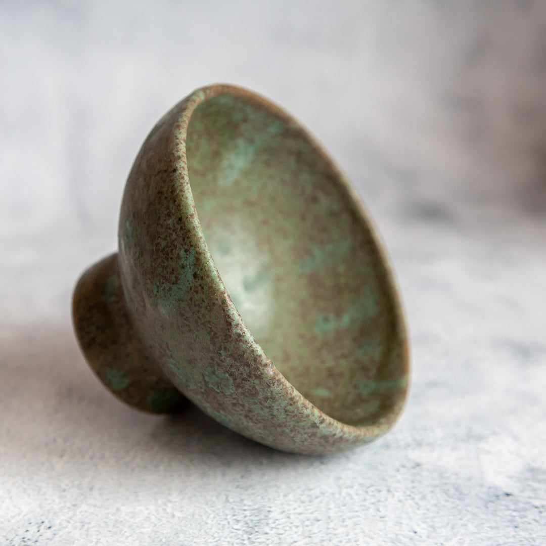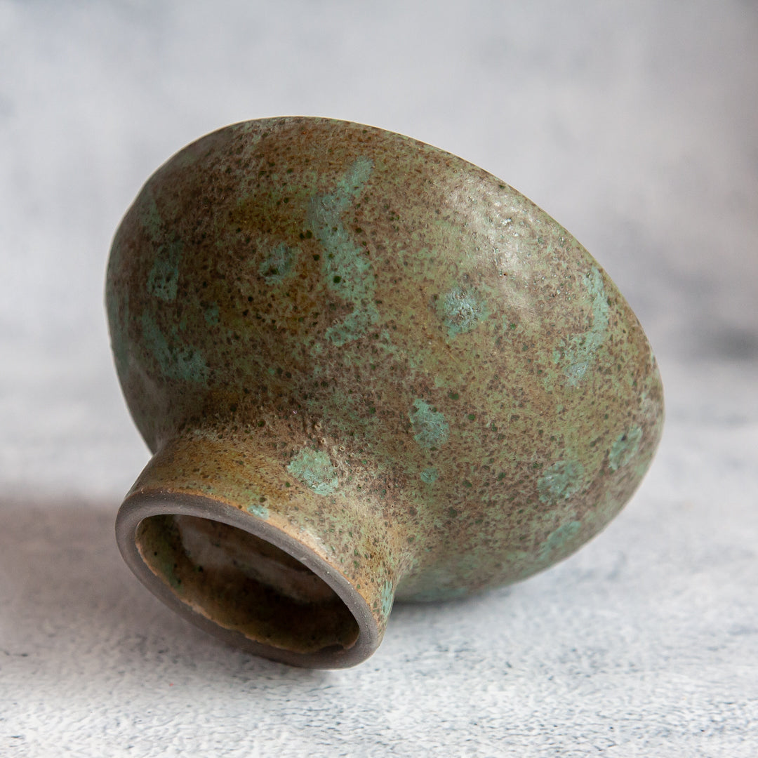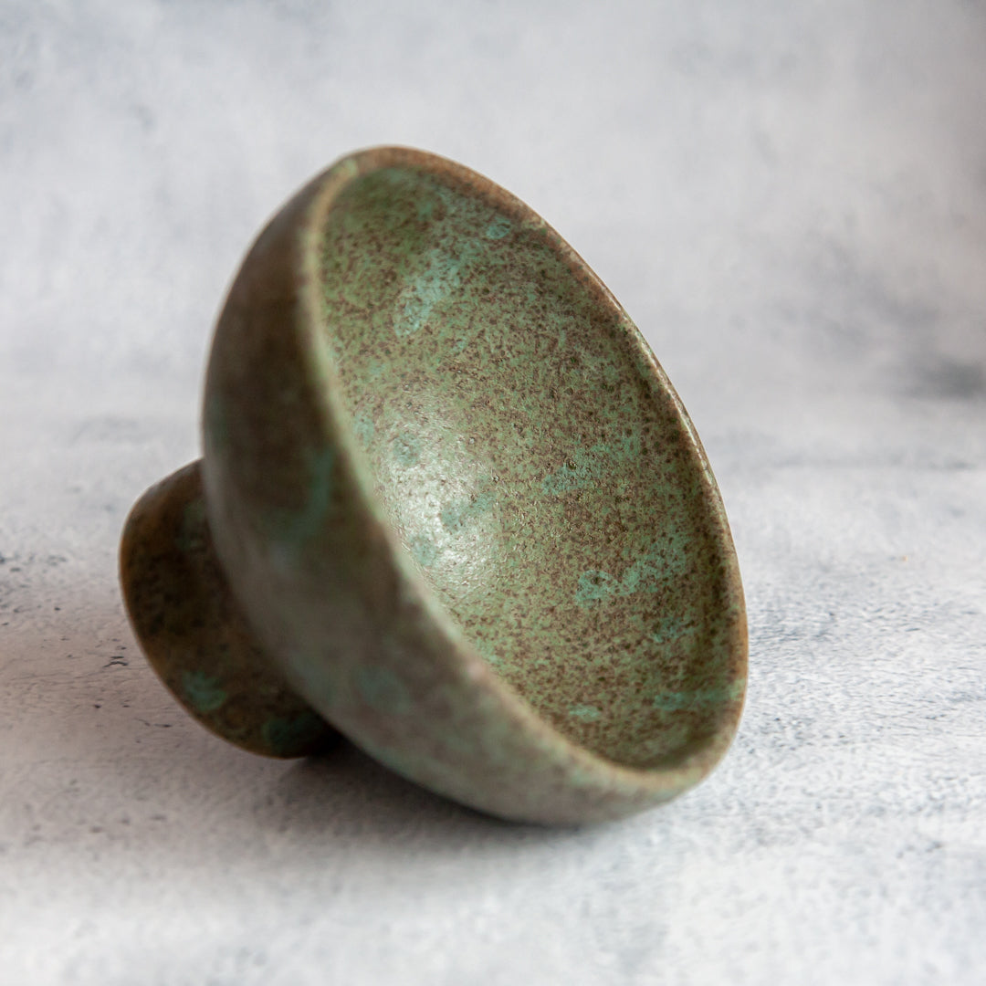 Dubens paviršius išmargintas smaragdo spalvos taškeliais, kurie įsilieja į pusiau matinį bei dėmėtą raštą. Glazūros netolygumas primena uolienos raštą. Indas gali būti naudojamas kaip interjero detalė arba būti skirtas susidėti smulkmenoms.