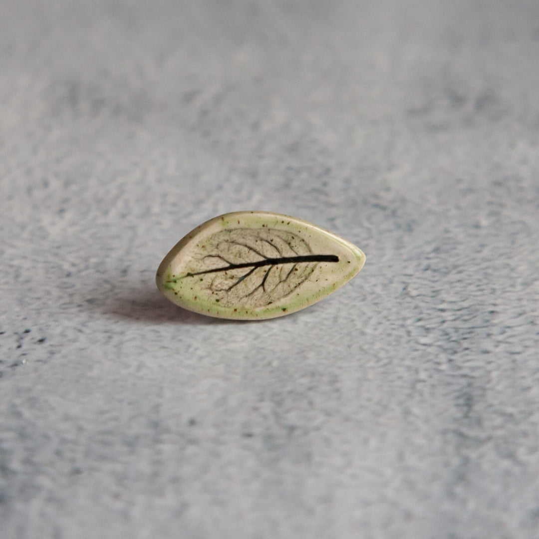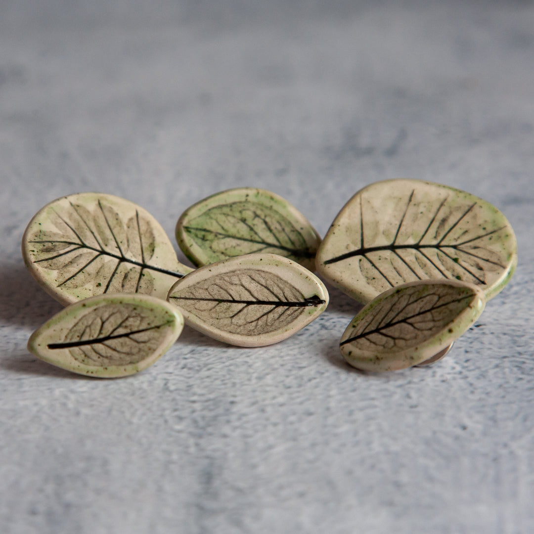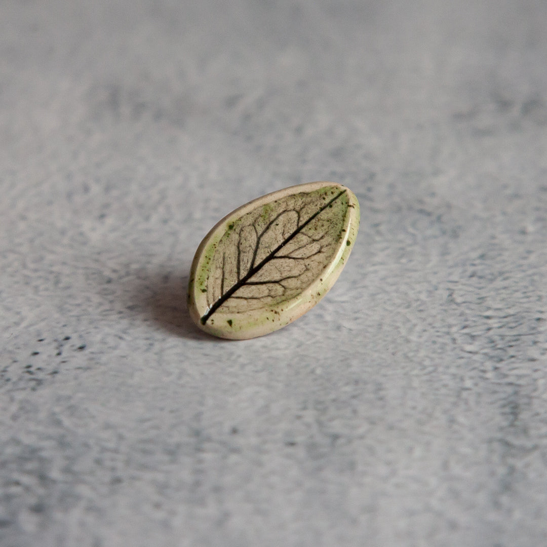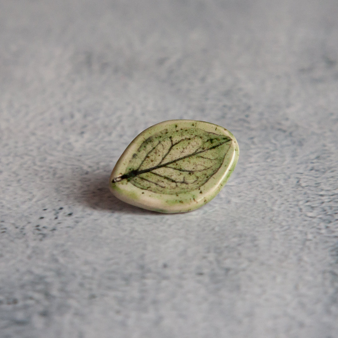 Tikrų lapelių įspaudai, kiekvienas unikalus ir neatkartojamas. Įspaudai paryškinti juodos glazūros pagalba, o paviršius padengtas žalsva, skaidria glazūra. Ženkliukai su metaliniu užsegimu.