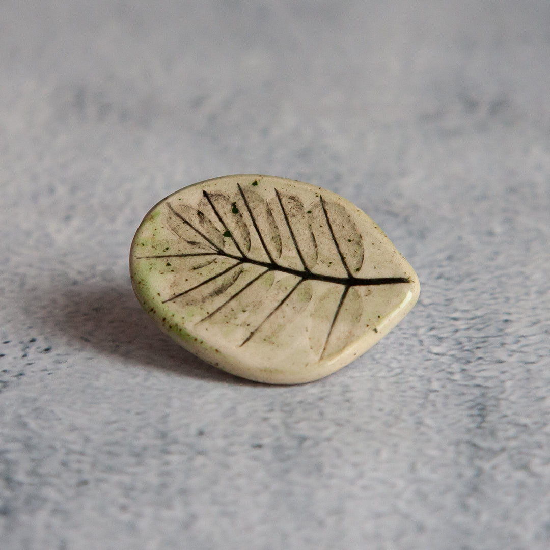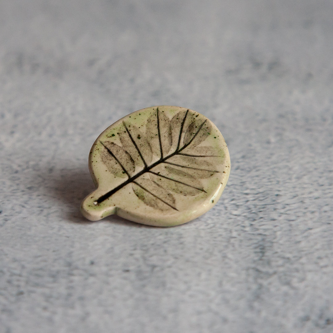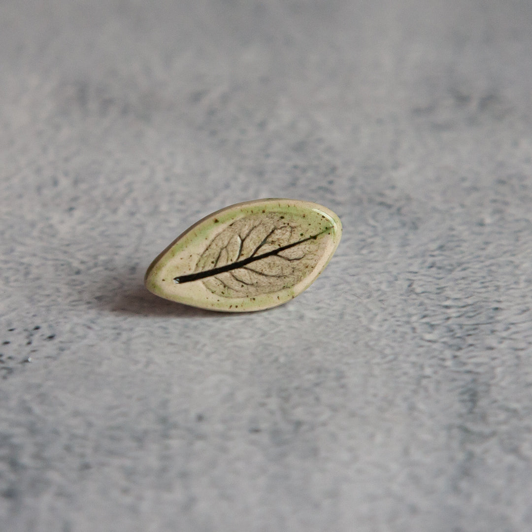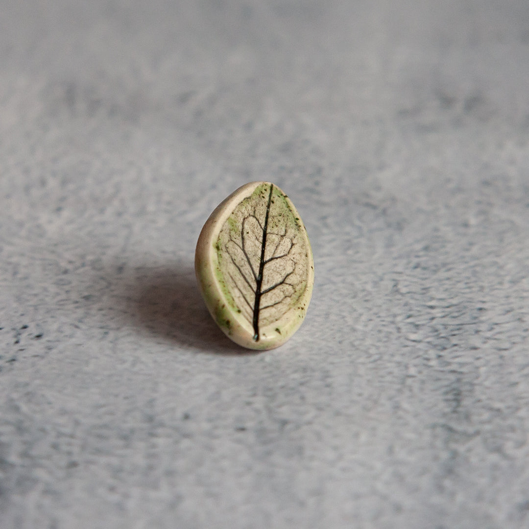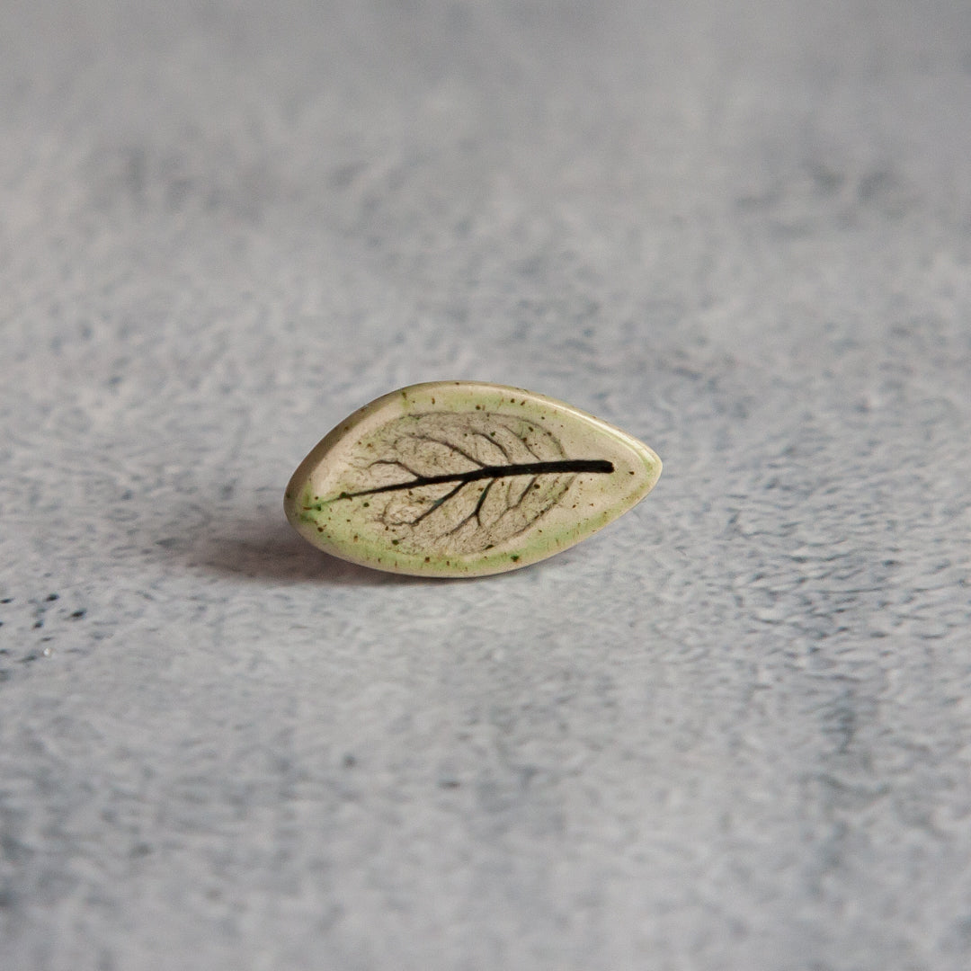 Tikrų lapelių įspaudai, kiekvienas unikalus ir neatkartojamas. Įspaudai paryškinti juodos glazūros pagalba, o paviršius padengtas žalsva, skaidria glazūra. Ženkliukai su metaliniu užsegimu.