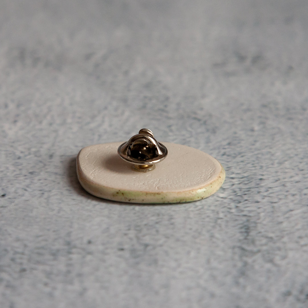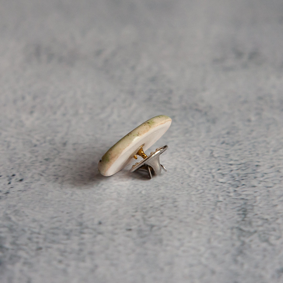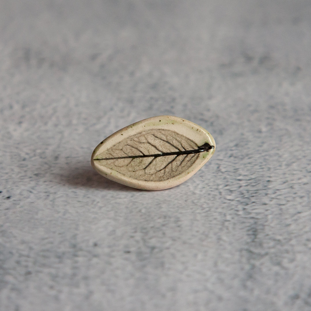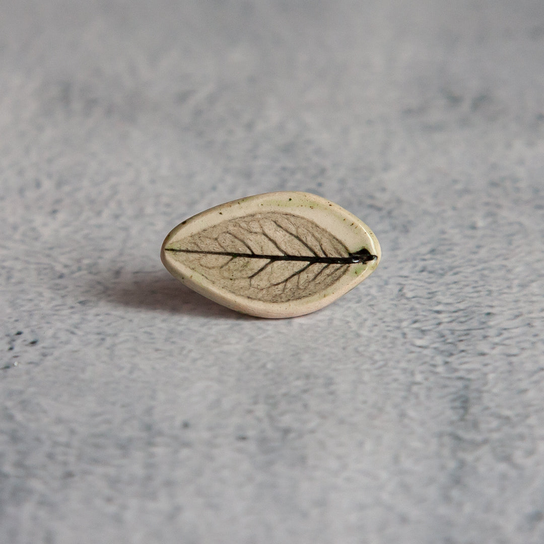 Tikrų lapelių įspaudai, kiekvienas unikalus ir neatkartojamas. Įspaudai paryškinti juodos glazūros pagalba, o paviršius padengtas žalsva, skaidria glazūra. Ženkliukai su metaliniu užsegimu.